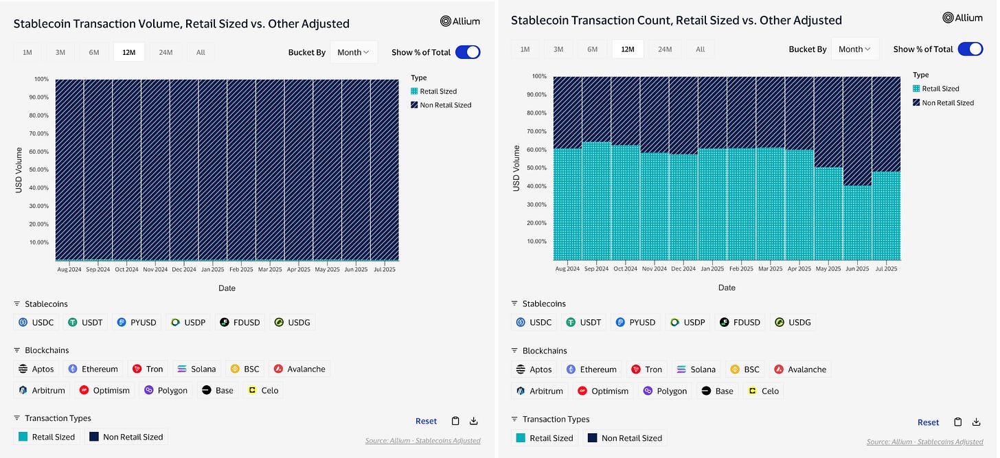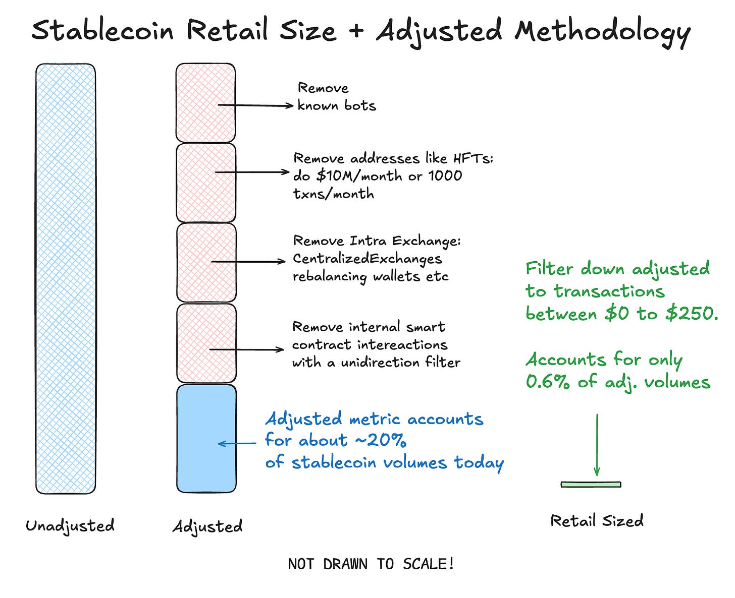 Despite retail-sized stablecoin transfers accounting for just 0.6% of adjusted notional volume, they make up ~40% of all adjusted stablecoin transactions.
