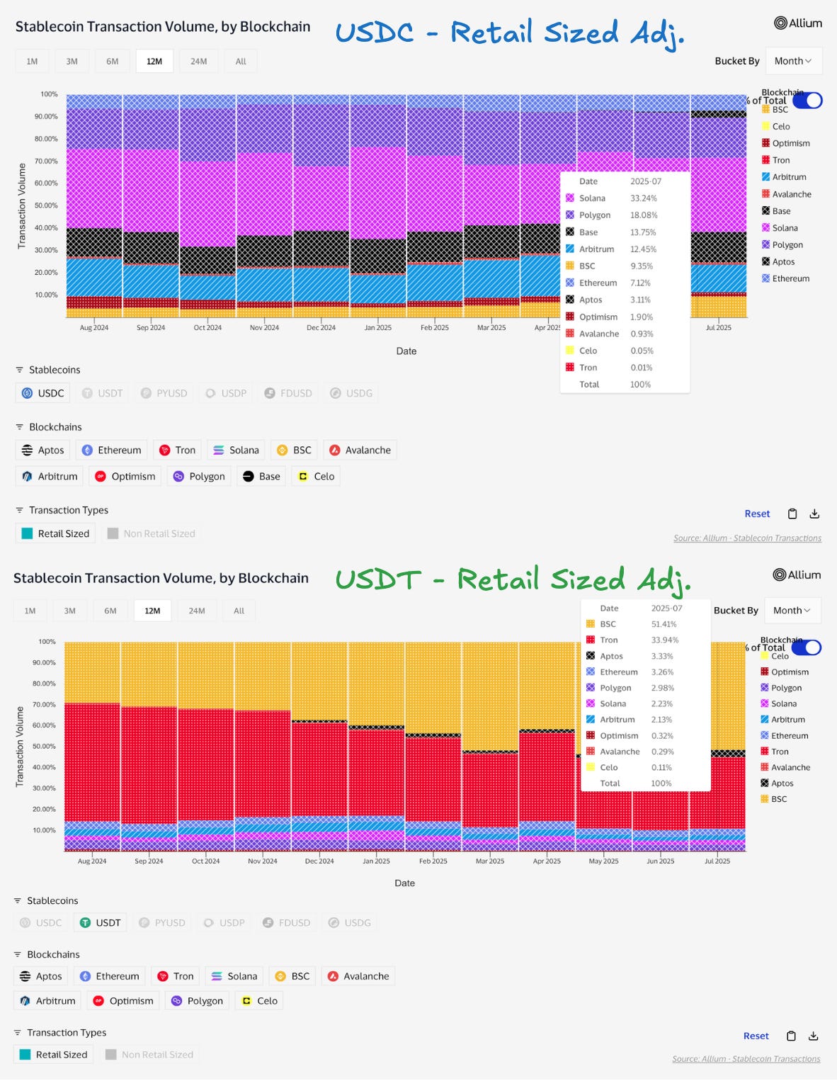 Retail favors Low Fees + High throughput chains: It is common for both USDT AND USDC retail volume that they happen on High throughput chains.