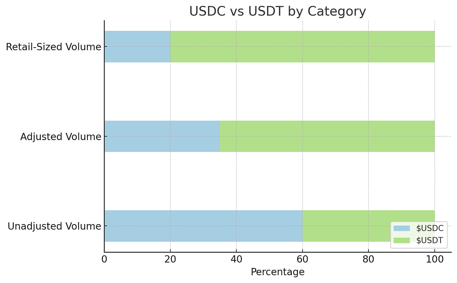 We can see that the “retail sized” turquoise graph is barely visible on the dashboard as it is only 0.6% of adjusted stablecoin volumes.